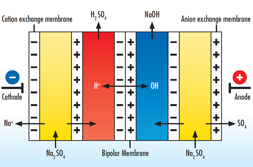 雙極膜技術(shù)的簡單的實施方案是所謂的3室堆疊—雙極膜電滲析。在這種情況下,堆疊中的重復(fù)膜單元由雙極膜,陽離子和陰離子交換膜組成。在電場中,陰離子通過陰離子交換膜遷移到陽極,保留陽離子在雙極性膜的一側(cè),并最終與雙極性膜中產(chǎn)生的質(zhì)子一起形成酸。以相同的方式,在雙極性膜的另一側(cè)上形成堿溶液,并在中央粗溶液室中形成稀釋液。
