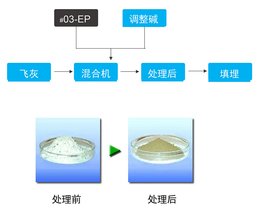 為了應對這樣的飛灰處理,我們開發(fā)了可以作為重金屬的固定處理劑的“NEP# 03 - EP”產(chǎn)品,運用到成本較低的液體螯合法,對飛灰少量添加,可與有害重金屬(Pb、Cd、Hg等)形成牢固結合,進行有效固定化,防止浸出。